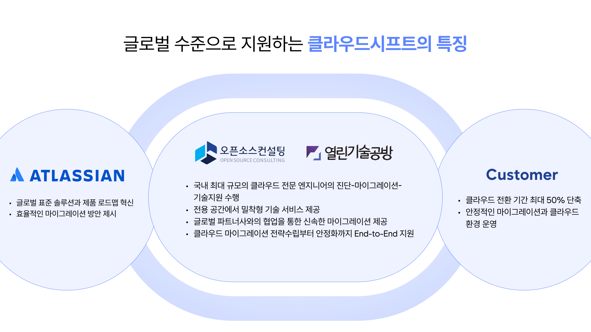 특히 오픈소스컨설팅은 국내 최대 규모의 아틀라시안 전문 엔지니어 조직을 보유하고 있으며, 아틀라시안 스페셜라이제이션인 클라우드 마이그레이션, 소프트웨어 개발, 서비스 매니지먼트를 모두 취득한 기술 노하우를 바탕으로 안정적인 마이그레이션을 수행할 수 있다.