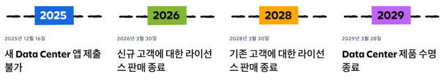 이 날짜 이후 신규 고객은 Data Center 제품 및 관련 앱을 구매하거나 견적을 요청할 수 없습니다. - 2028년 3월 30일 – 기존 고객을 대한 라이선스 판매 종료